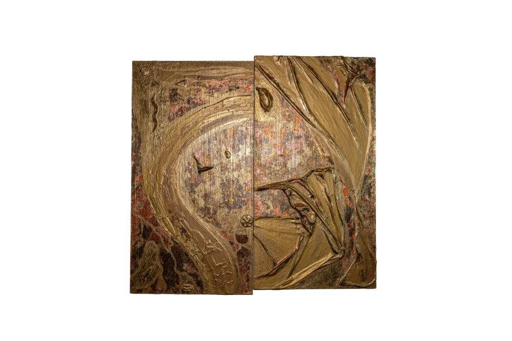 Fragment ist ein faszinierendes abstraktes Diptychon, bestehend aus zwei separaten, dünnen MDF-Platten, die mit einem minimalen Abstand zueinander an der Wand präsentiert werden und so eine subtile visuelle Verbindung und ein Spiel mit der Wandfläche erzeugen. Die Oberfläche beider Platten ist opulent in Goldtönen gehalten, wobei die Verwendung von Blattgold in verschiedenen Variationen schimmernde und changierende Effekte erzeugt, die das Licht auf besondere Weise einfangen. In dieses Goldensemble sind Fragmente eines speziellen Stoffes eingearbeitet, der in eine feste, gipsartige Form verwandelt wurde und so organische Texturen und Strukturen bildet. Skulpturale Elemente und Texturmassen ergänzen die Komposition auf beiden Platten und verleihen dem Werk eine zusätzliche haptische Dimension und Tiefe. 'Fragment' feiert die Schönheit des Unvollkommenen und die faszinierende Verbindung unterschiedlicher Materialien und Oberflächen in einem spannungsvollen Dialog zwischen den beiden Bildelementen. Es ist ein Blickfang, der durch seine edle Anmutung und seine vielschichtige Beschaffenheit Betrachter in seinen Bann zieht und durch den subtilen Zwischenraum eine besondere Leichtigkeit erhält.